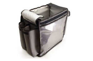 Bolso liviano con tirantes tipo cordón para cerrar y transportar. Diseño con impresión a dos colores en parte frontal.