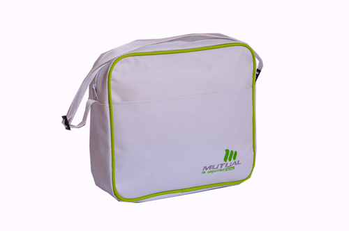 Bolso simple con un bolsillo principal con cierre superior y bolsillo plano en exterior. Incluye manilla ajustable.