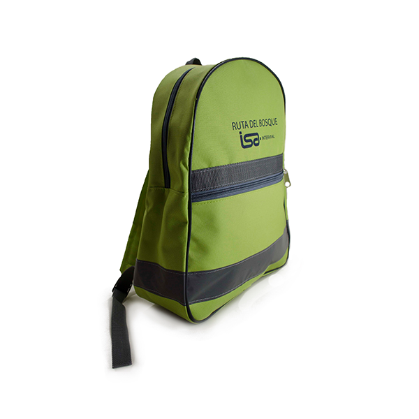 Mochila con compartimiento principal con cierre medio y bolsillo frontal con cierre horizontal. Incluye cinta reflectante, tirantes ajustables y colgador.